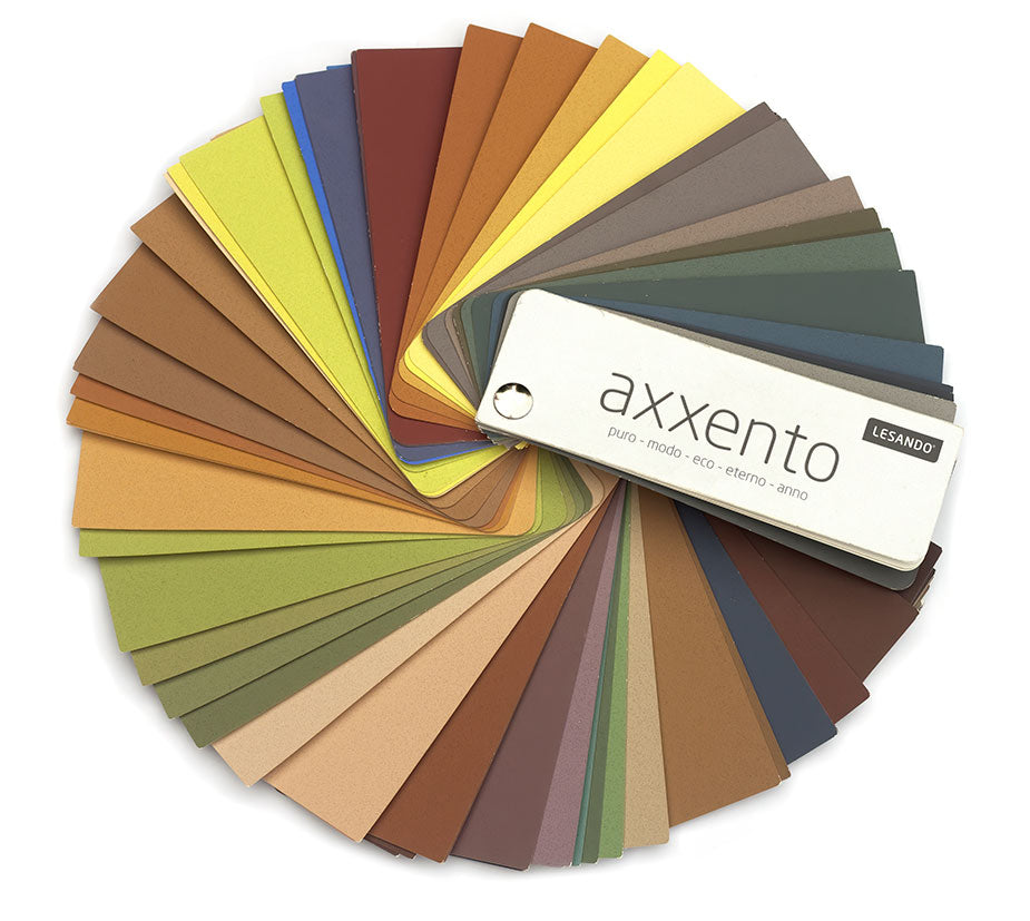 Der Farbfächer Axxento bietet die intensivsten Farbtöne aus den jeweiligen Farbfamilien an. Perfekt um eine Akzent im Raum zu setzen, der farblich exakt zu den restlichen Oberflächen abgestimmt werden kann.